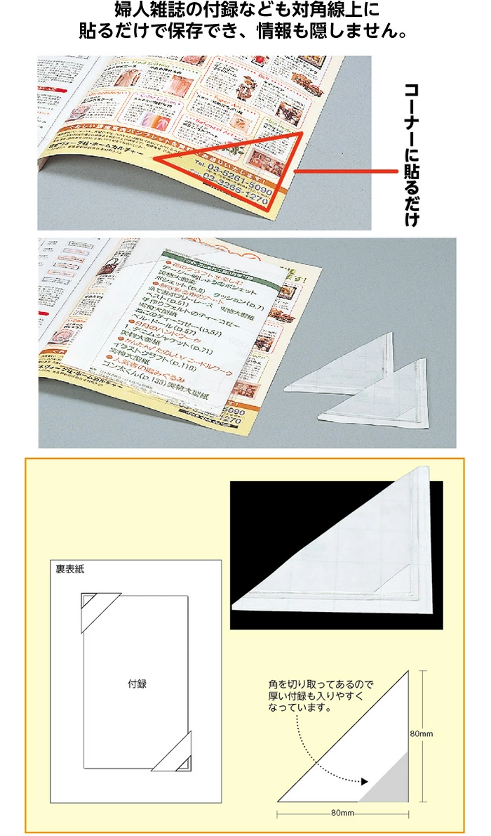 婦人雑誌の付録なども対角線上に貼るだけで保存でき、情報も隠しません。