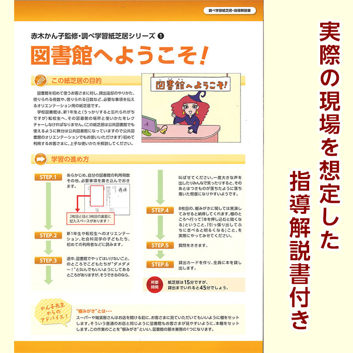 かわいく見やすいイラストと、かんこ先生の指導解説書で子供たちも楽しんで図書館のことや、利用の仕方を知ることができます。