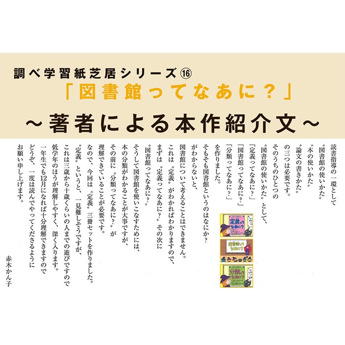 「図書館ってなあに?」、「定義ってなあに?」、「分類ってなあに?」の図書館を使いこなし、勉強の基礎をつくるための 3部作の第1作目