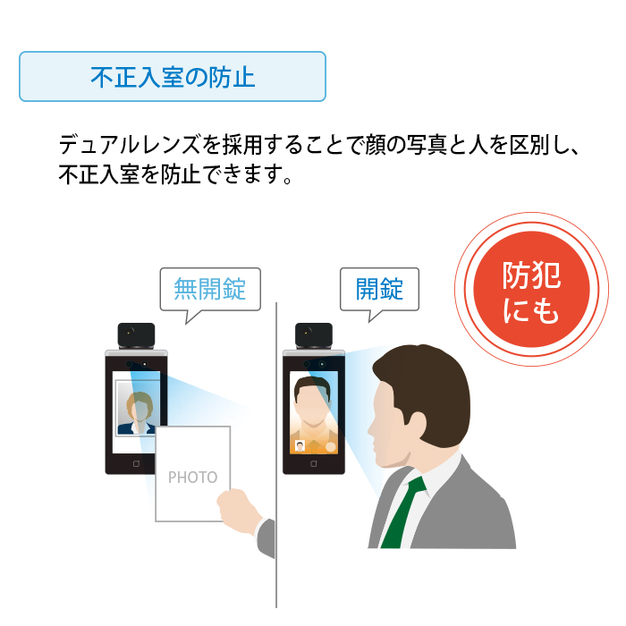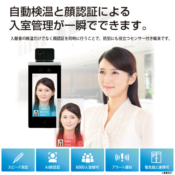 入館者の検温だけでなく顔認証を同時に行うことで、防犯にも役立つセンサー付き端末です。