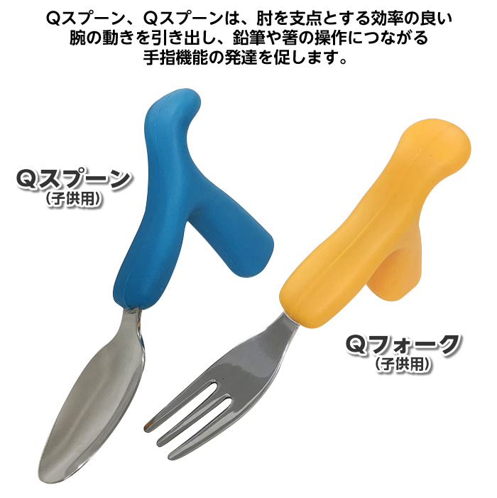 Qフォークは肘を支点とする、効率の良い腕の動きを引き出し、鉛筆や箸の操作につながる手指機能の発達を促します。