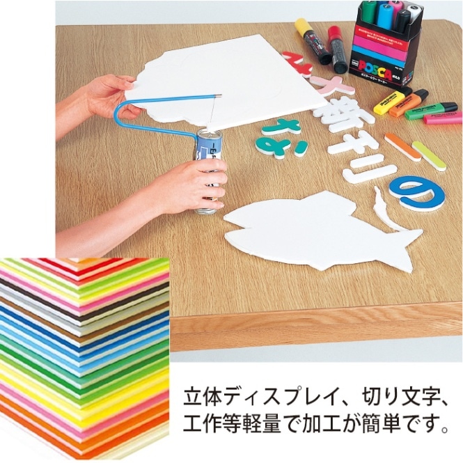 特殊印刷による光沢のあるボードで、POP、切り文字などに最適なスチロールボードシリーズ。立体ディスプレイ、切り文字、工作等、、軽量で加工が簡単です。