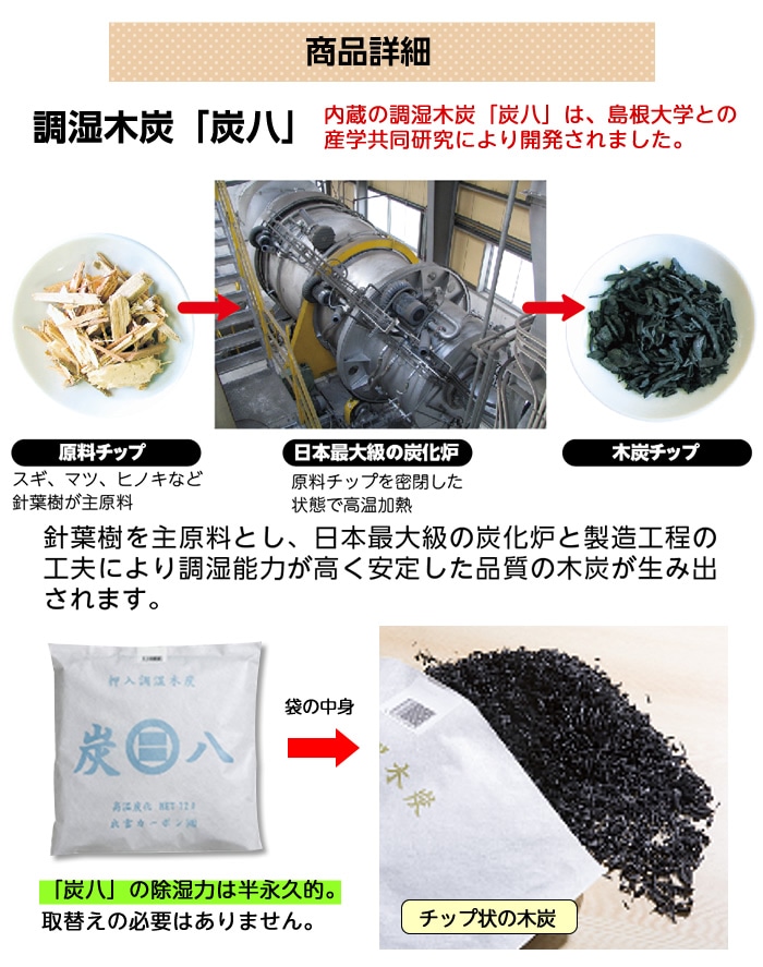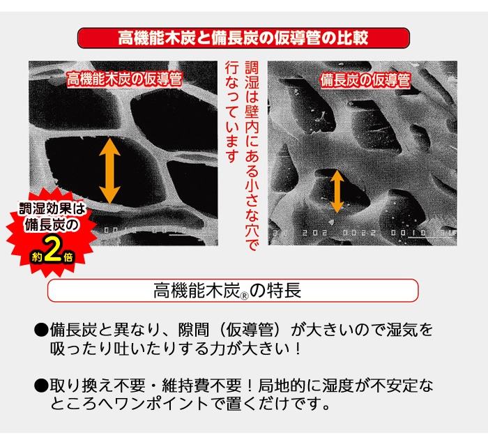 商品特長 高機能木炭は、島根大学との共同研究によって、調湿する能力が科学的に証明されたハイテク木炭です。