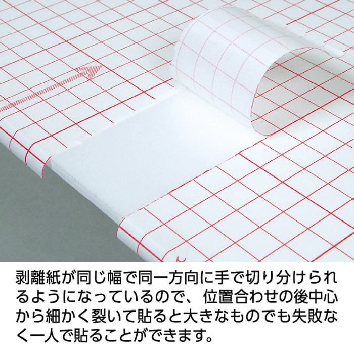 ●剥離紙が同じ幅で同一方向に手で切り分けられるようになっているので、位置合わせのあと、中心から細かく裂いて貼ると大きなものでも失敗無く一人で貼ることができます。