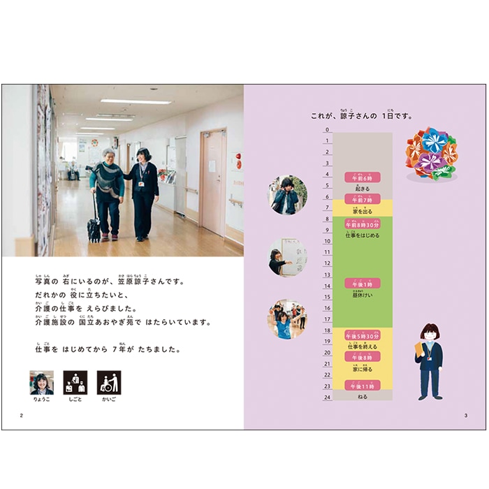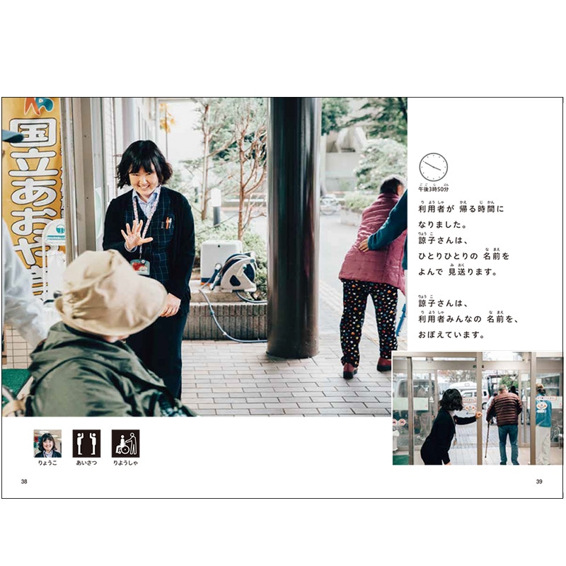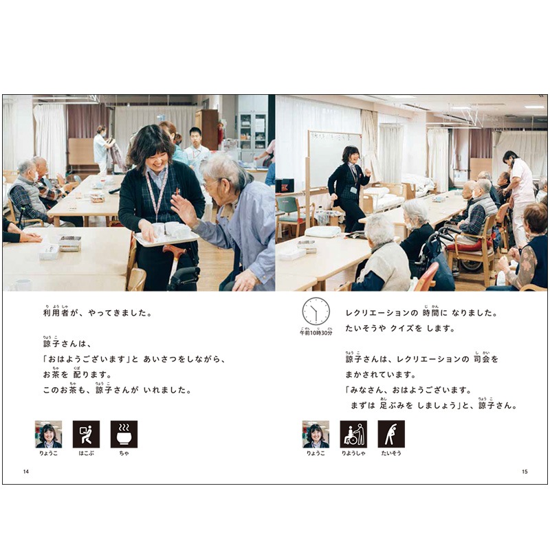 キーワード えるえるぶっく、エルエルブック、知的障害、学習障害、発達障害、ADHD、日本語、バリアフリー、障がい者差別解消法、LLブック、LLブック、LL本、LL本、絵本、児童書、特別支援学校、図書館、学校、特別教室、ピクトグラム、しごとにいってきます、かいごのしごと りょうこさんのいちにち、点字、音声読み上げ、拡大文字の図書 (IT機器の音声読み上げ機能)