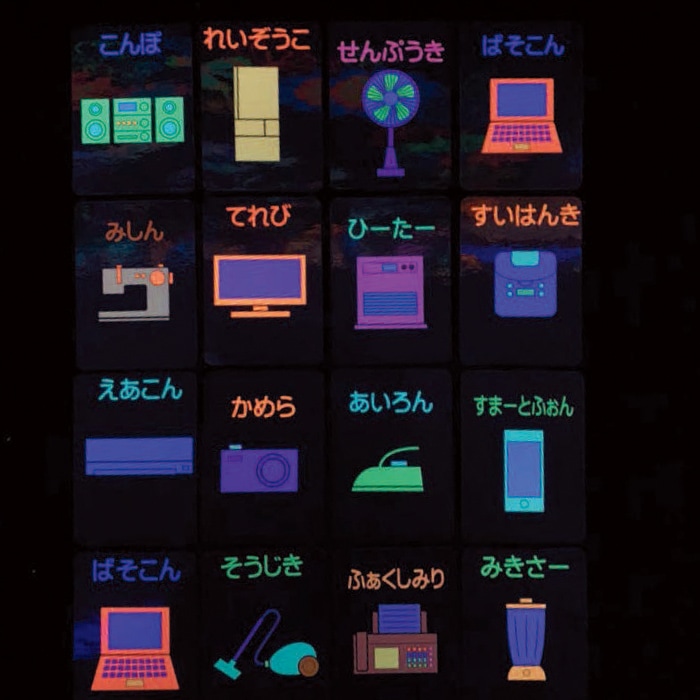 ブラックライトでひかる、かでんカードです。