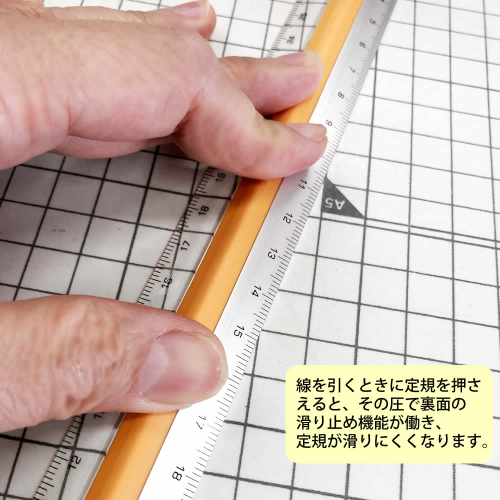 押さえると定規が滑らないので、線を引くときやカッターを使うときにズレることはありません。